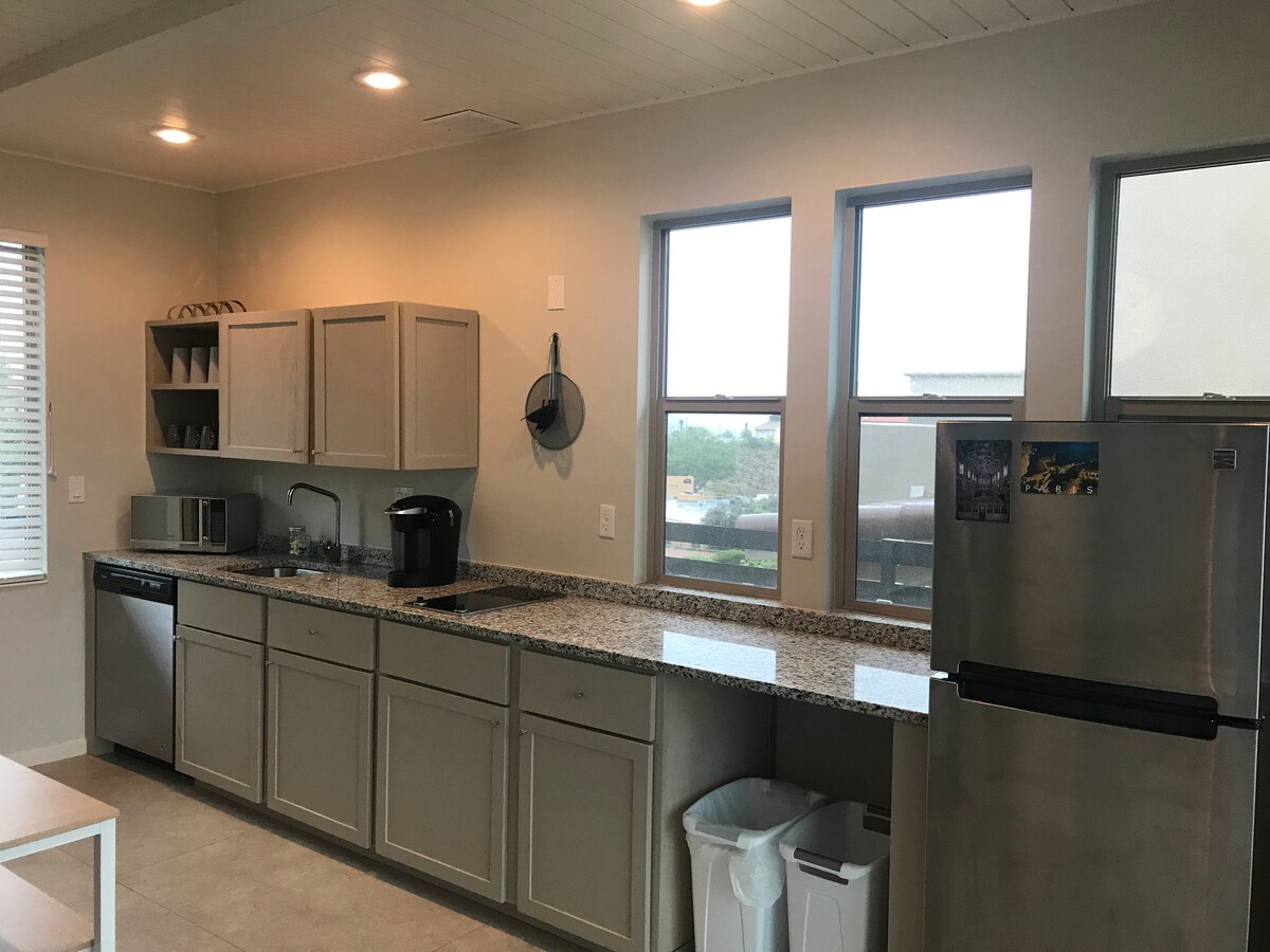 Upscale NW El Paso studio w/ free Tesla charging. This private, dog-friendly retreat features a home gym, dedicated desk, & fast Wi-Fi. Relax on the cognac leather sofa with a massive 75” TV. The gourmet kitchen boasts quartzite counters for home-cooked meals, while an in-unit washer/dryer makes long stays seamless. Enjoy the shared backyard BBQ & basketball hoop or walk 7 mins to the dog park. Coffee Station: Brew,K-Cup & espresso. Experience the ultimate work-play balance in your desert oasis.