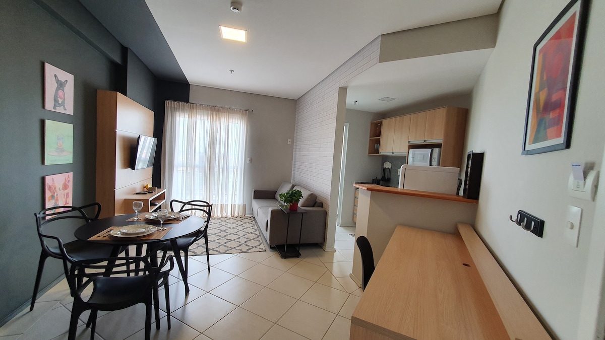 O Setin Midtown campinas está lhe esperando. Nosso apartamento estilo estúdio tem 45m2 com conceito totalmente aberto, completo em utensílios, com ar condicionado, todas as comodidades que você gostaria de ter em sua hospedagem combinados com uma decoração moderna. Contamos com garagem privativa, portaria 24h e "mercadinho". Estamos a 17 min do aeroporto viracopos, 5min do Royal Palm Eventos.