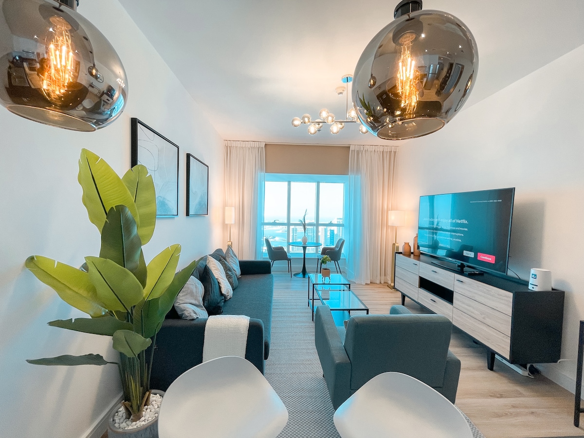 Dobrodošli v luksuznem visokem nadstropju 2BR v DAMAC Heights z veliko zakonsko posteljo, spalnica z zakonsko posteljo, raztegljiv kavč za 2 osebi, pametna TV, Netflix/Prime/Disney+ in zasebni balkon s pogledom na morje, Palm & Dubai Eye. ~Le 2 minuti hoje do sprehajališča Dubai Marina Walk in blizu tramvajske postaje Marina. ~Oprema: bazen, telovadnica, savna, kino, receptor, brezplačno parkiranje in varnostna služba, ki je prisotna ves čas. ~ Peš (2 minuti) od supermarketov, restavracij in potrebščin.