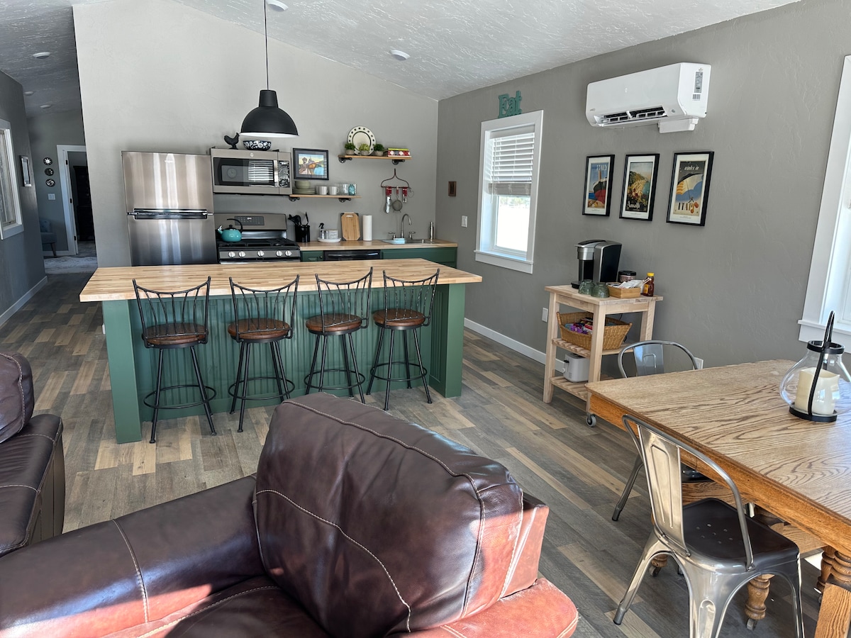 Nestled near Goldbug Hot Springs, our 1-bedroom suite is a perfect getaway. We are walking distance to the Goldbug Trailhead! The suite features a unique floating king bed with mood lighting for restful sleep. The quaint kitchenette is equipped for basic meal preparation, complemented by a coffee machine and a patio dining area with mountain vistas. Enjoy modern comforts like high-speed WiFi, flat-screen TV, and adjustable AC/Heat. This is a hotel-style unit that shares a wall with another unit.