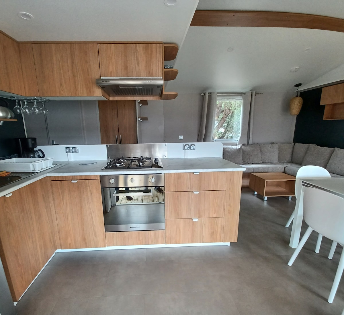 MOBILHOME 6-sedežni 40 m² z reverzibilno klimatsko napravo, veliko ograjeno zunanjo teraso z 1 zavarovanimi vrati, vrtnim pohištvom in 2 ležalnikoma. Velika dnevna soba z vrtljivim televizorjem, 1 raztegljivim kavčem, 2 velikima spalnicama, vključno z 1 glavno spalnico, vrhunsko posteljnino z veliko garderobo in televizorjem Popolnoma opremljena kuhinja, posoda, pečica, mikrovalovna pečica, kuhalna plošča, hladilnik z zamrzovalnikom , opekač kruha, grelnik vode, aparat za filter kavo in stroki TASSIMO, pomivalni stroj, pralni stroj in linija za pranje perila.