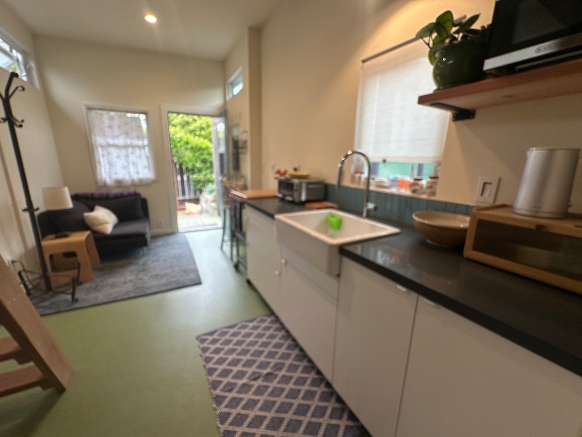 Spacious and peaceful back yard bungalow house. Enjoy coffee in the garden as the sun rises or enjoy the hot tub after a day exploring all the Bay has to offer. Sleep deeply in the king size bed, quietly tucked off the street. Get remote work done in bright dedicated office filled with plants. Enjoy meals in chefs kitchen. Kick back and relax in this calm, stylish space.