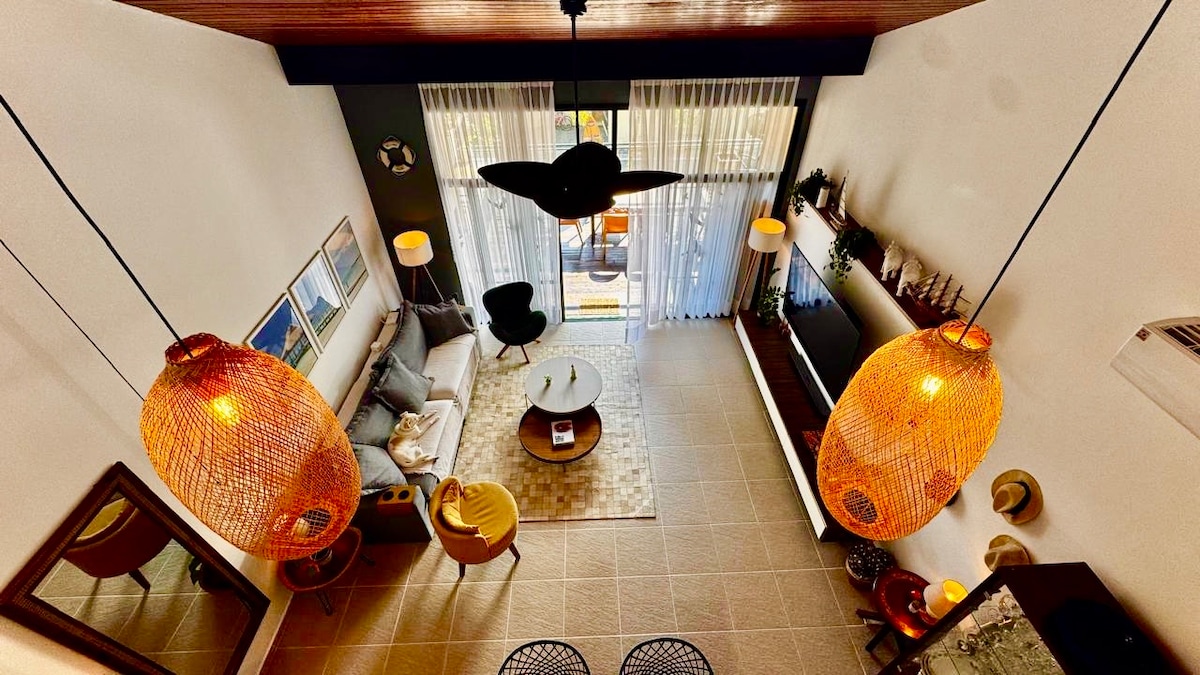 Apartamento com vista para o mar no melhor canto de juquehy! O Guaimbê é um dos apartamentos da Øko Villa! Possui uma sala com cozinha integrada, 1 quarto e banheiro com uma vista para mata! Cama king size, lençóis 400 fios, toalhas de banho e praia. Cozinha toda equipada! Caso seja necessário, é possível colocar uma cama auxiliar One of the best apartments in Juquehy beach overlooking the ocean and rainforest. 51 square meter apartment with a big living room area and modern kitchen.