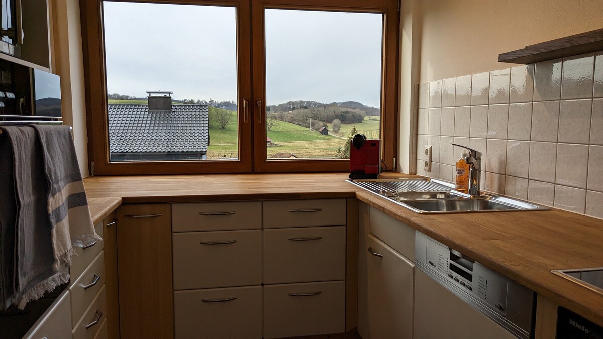 Elegantno stanovanje v pritličju s pogledom na grad Lichtenstein in približno 65 m² prostora je popolnoma opremljeno. Nahaja se v družinski hiši in ima ločen vhod. Družinam nudimo potovalno otroško posteljico in otroški stol za hranjenje. Lahko začnete hoditi neposredno iz hiše in ste v naravi. Grad Lichtenstein in Sonnenfelsen sta dosegljiva peš. V vasi je »nakupovalna posoda« za vsakodnevno uporabo.