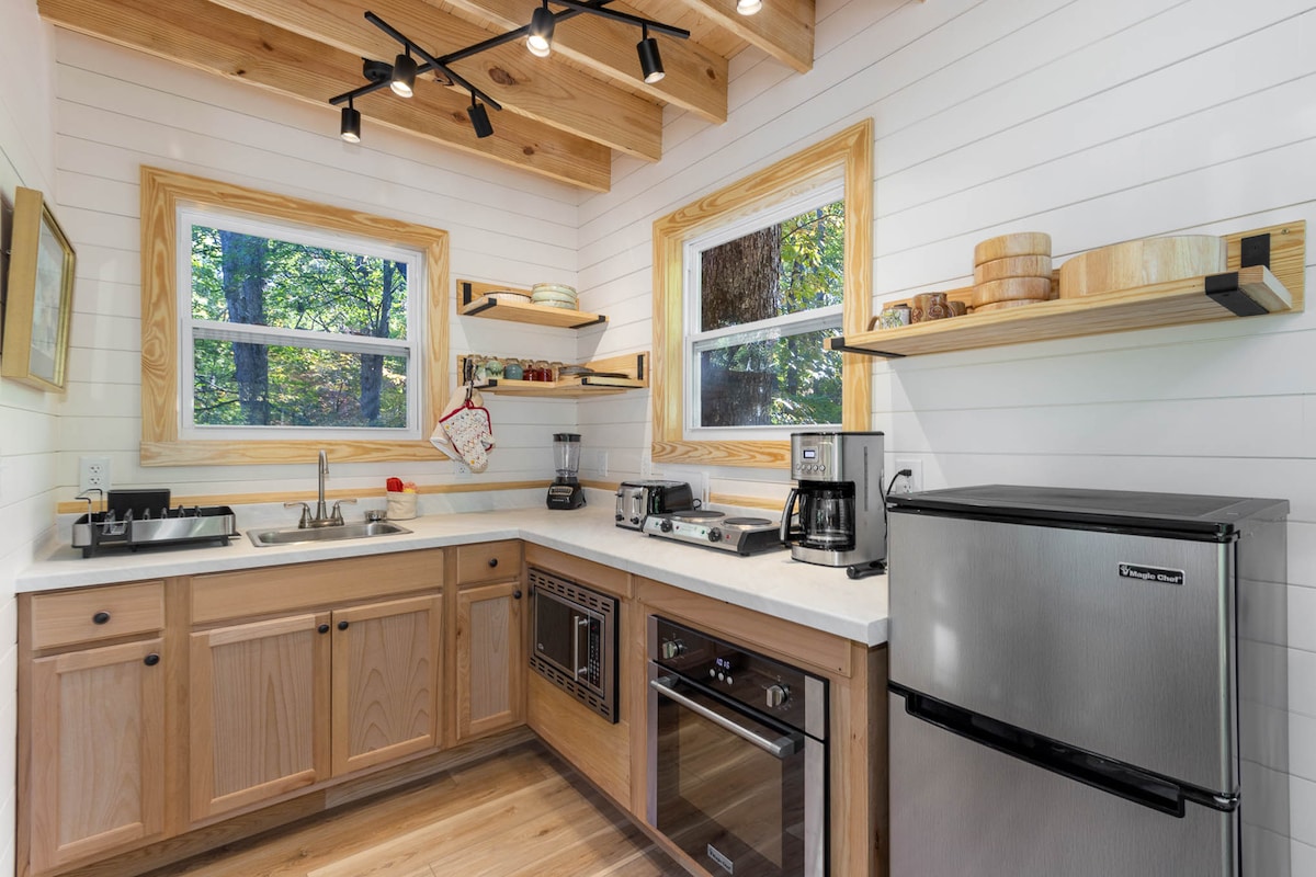 Timberwood Tiny Home is a place to rest your head & heart in Efland, North Carolina. Mirno zatočišče se nahaja po podeželski cesti, približno 10 minut od središča Hillsborougha. Mini-hiška, velika 200 kvadratnih metrov, se nahaja v zasebnem kotu 8 hektarjev, ki si ga delimo z našo glavno hišo. Vključuje podrobnosti v skandinavskem slogu, dve postelji, prostorno verando, bogato naravno svetlobo, masažno kad na drva, savno v sodu, hladen potop in še več. Obstajajo posebnosti prenočišča, zaradi katerih je morda neprimerno za otroke.