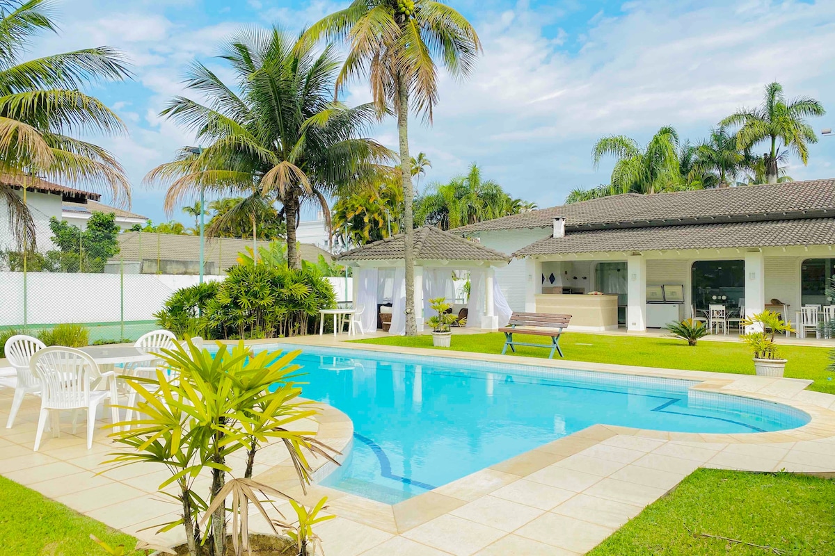 Linda casa localizada a 180mts na praia da Enseada de areia branca e agua cristalina , em bairro nobre com toda a estrutura necessária para sua hospedagem( restaurantes , esportes náuticos , mercados) tudo bem próximo . Com uma sala ampla totalmente integrada com a varanda gourmet e piscina, sendo assim proporcionando um ambiente muito agradável e possibilitando uma integração de todos os hospedes independente a onde esteja .Isso tudo com vista para um belo jardim.