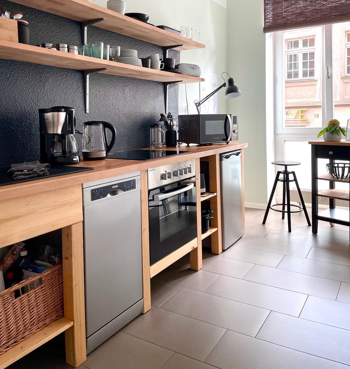 Die Wohnung befindet sich im Erdgeschos und bietet Platz für 2 Personen. Das Bad ist ausgestattet mit großer bidentiefer Dusche, Infrarotkabine, Fußbodenheizung. Die Küche ist vollwertig ausgestattet Kaffemaschine, Toaster, Wasserkocher. In dieser integriert ist auch der Waschtrockner. Die hohen Decken und großen Fenster ergeben ein tolles Raumgefühl, welches durch moderne LED Lampen unterstrichen wird. Dimmen Sie die Räume oder stellen Sie ihre Lichttemperatur nach Wunsch ein.