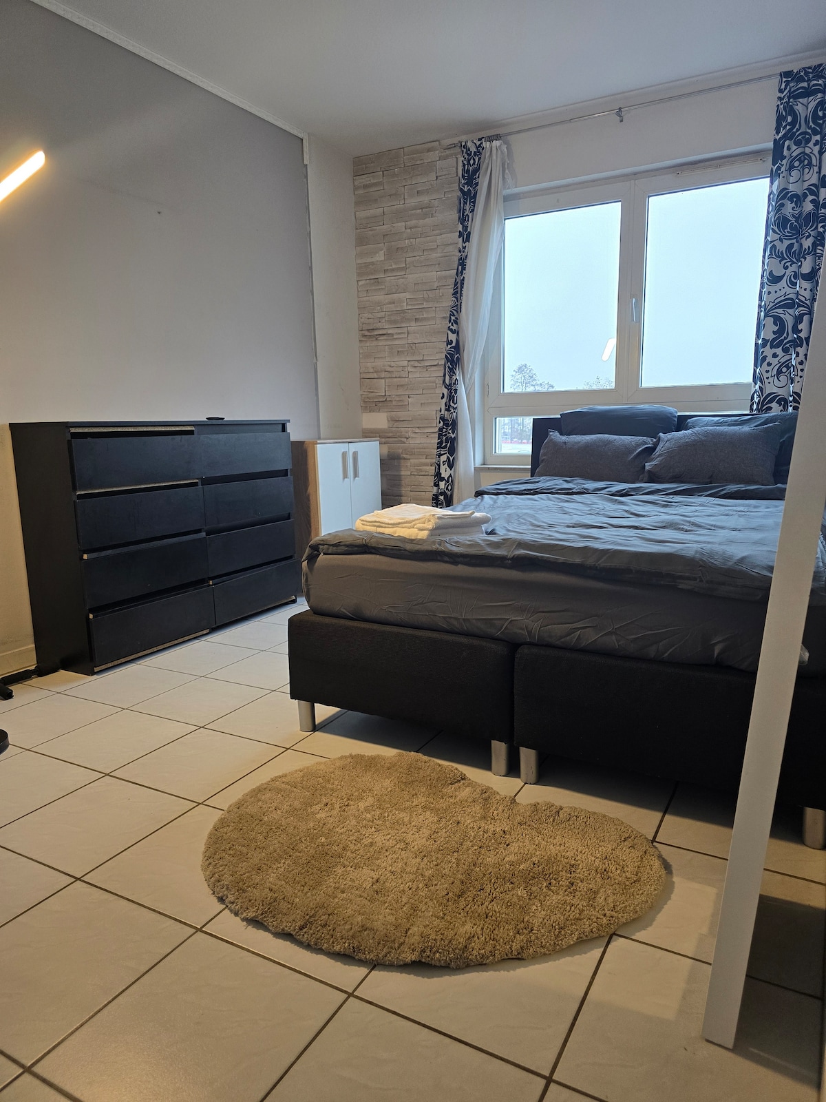 Stanovanje je ločeno v stalno naseljeni enodružinski hiši v bližini razstavnega centra. Enostavna hoja do javnega prevoza. S tramvajem ste v središču mesta v nekaj minutah. Stanovanje s skupno 30 m2 je razdeljeno na 3 sobe: Na voljo sta 2 enojni postelji, zasebna kopalnica in soba, ki ju lahko uporabljate kot jedilnico ali delovno sobo. Kuhinja ni na voljo.