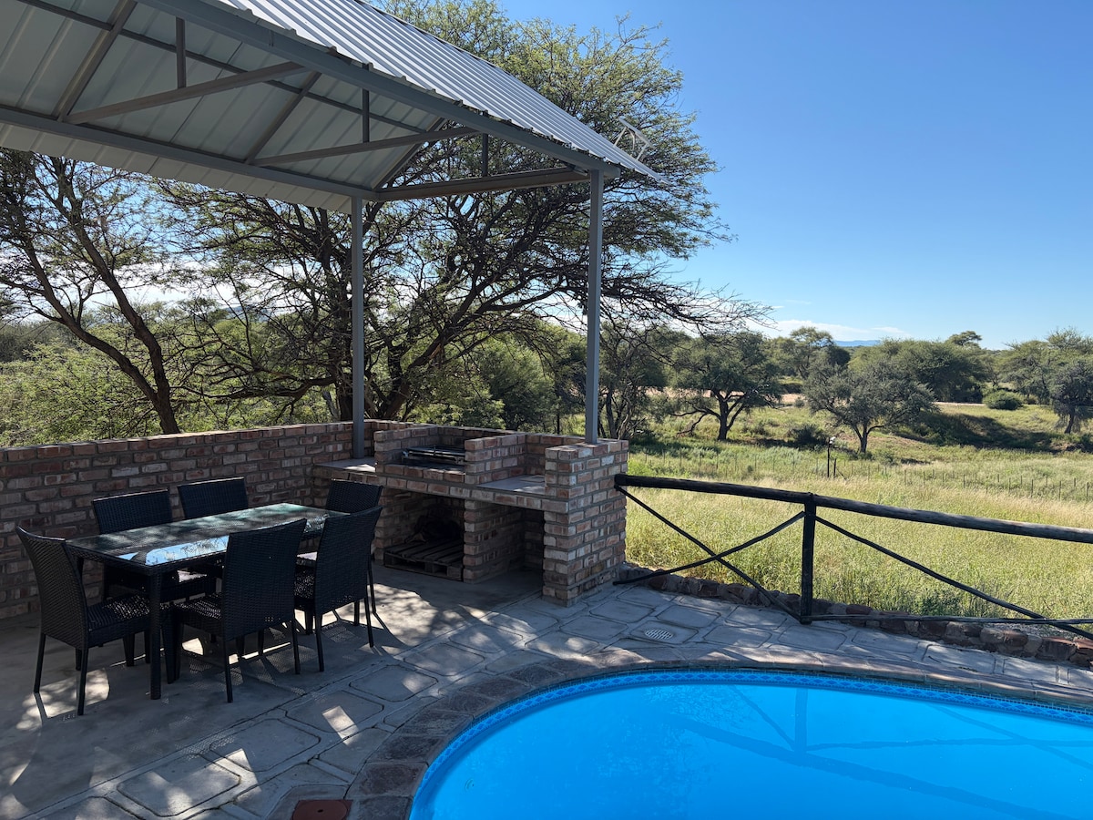The property offers: -Now new! A traditional "Braai" for all your grilling needs - Spacious, cozy bedrooms equipped with A/C units - A fully equipped kitchen ideal for self-catering - An outdoor swimming pool — perfect for cooling off and enjoying the Namibian sun - A dedicated yoga and meditation room for mindful relaxation or light exercise - A large living room with comfortable seating, a flat-screen TV, - Fast Wi-Fi throughout the property - Secure parking and a safe, peaceful environment