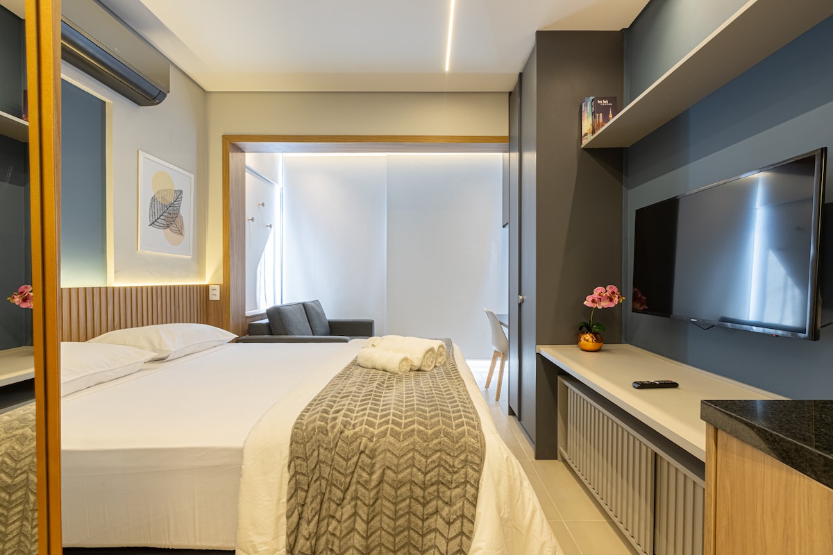Doživite edinstveno doživetje v vrhunskem stanovanju z edinstveno oblikovanim pohištvom, vrhunskim posteljnim in kopalnim perilom ter privilegirano lokacijo. Vsaka podrobnost je bila zasnovana tako, da zagotavlja udobje, prefinjenost in praktičnost. Idealno za tiste, ki iščejo prefinjenost in dobro počutje v eni najboljših regij v mestu. Kot nalašč za prosti čas ali poslovna potovanja. Garsonjera je blizu pomembnih ustanov in podzemne železnice ESPM Colleges, Fine Arts Metro Vila Mariana Av Paulista