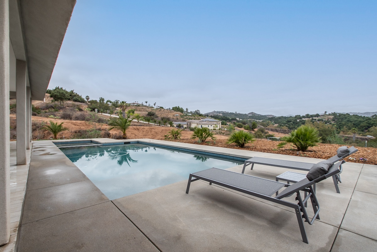 Uživajte v mirnem pogledu na gore v našem prenočišču 3BR/2.5BA z enim nivojem! Popolnoma nova gradnja. Udobno spi 9-10 gostov. Zunaj boste našli čudovit bazen z masažno kadjo. Prepustite se najboljšim doma pripravljenim obrokom, skupaj igrajte igre in se sprostite po sončnem popoldnevu v bazenu in masažni kadi! 2,1 milje do Safari parka San Diego 3 milje do vinske kleti Orfila 3 milje do nakupovanja živil 30 min do Sea Worlda Blizu plaž, gora, živalskega vrta, nakupovanja, Legolanda itd.
