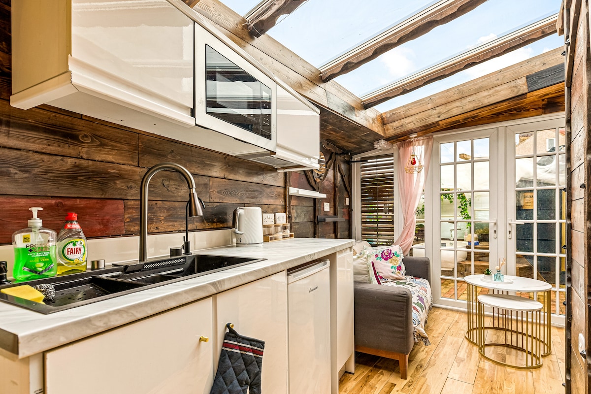 This is a stand alone unit totally self contained with shower and toilet. Unlike garden rooms this unit has wheels and a tow bar. The (should I say) Shepherdess Hut as it was used by a small holder during lambing to be close to her flock. Not suitable for long stays. More details below in The Space. Our small orchard has 2 x cherry, plum, 3 x pear, 2 x apple, greengage, apricot, mulberry, medlar and olive. We also have two 2 x raspberry, loganberry, Japanese wine berry and our own hops