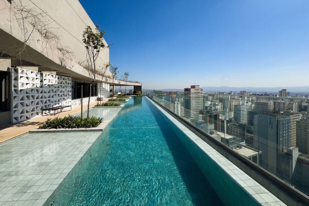 Estúdio espaçoso com muito design, arquitetura e a melhor vista de São Paulo. Loft completo! Com cama queen, closet, ar condicionado silencioso, cozinha completa, home office, WI-FI, TV 55” e uma belíssima banheira de imersão, de onde pode apreciar o seu drink preferido e curtir uma vista apaixonante. São Paulo toda estará há poucos minutos de você. Acesse o metrô andando apenas 200m. Reserve com tranquilidade! Proporcionaremos uma excelente hospedagem e uma ótima experiência!