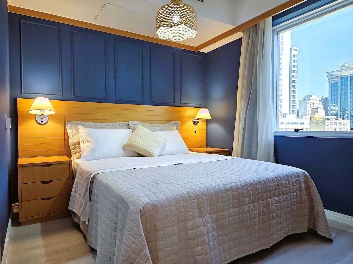 Sprostite se v tem mirnem in elegantnem prostoru. Meu Ap daje prednost udobju, počitek po napornem dnevu v metropoli. Idealno za največ 2 osebi, opremljeno s standardno hotelsko posteljo Queen, klimatsko napravo, 250 MB internetom, 42-palčno pametno televizijo in kuhinjo z mikrovalovno pečico, indukcijskim štedilnikom, aparatom za sendviče, opekačem kruha, električnim grelnikom vode, aparatom za kavo in mini hladilnikom. Ima pisalno mizo za 2 osebi z udobnimi usnjenimi stoli. Spali boste z okni proti hrupu in 100-odstotno zatemnitvenimi zavesami