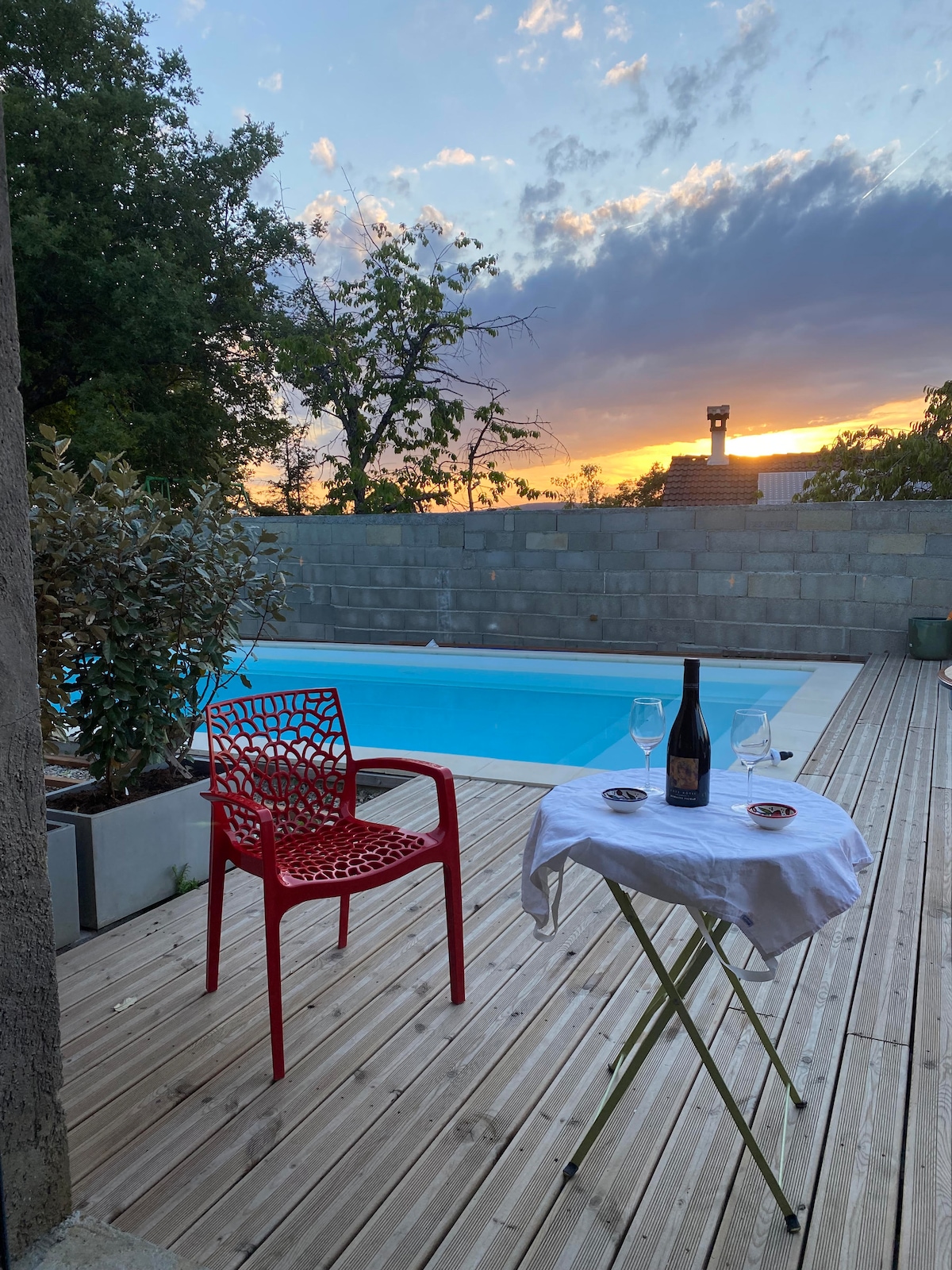 Dépendance entièrement rénovée avec coin cuisine (four micro onde, cafetière Nespresso, évier) et salle de bain WC. Terrasse privative donnant sur piscine. La dépendance se situe sur le terrain des propriétaires. Il faut contourner la maison principale pour y accéder. Il existe un vis à vis. La piscine est partagée avec les propriétaires et chauffée en juillet/août Située en pleine nature sur les hauteurs de Vienne, à 5 minutes du centre ville en voiture. Vue dégagée surplombant Vienne.