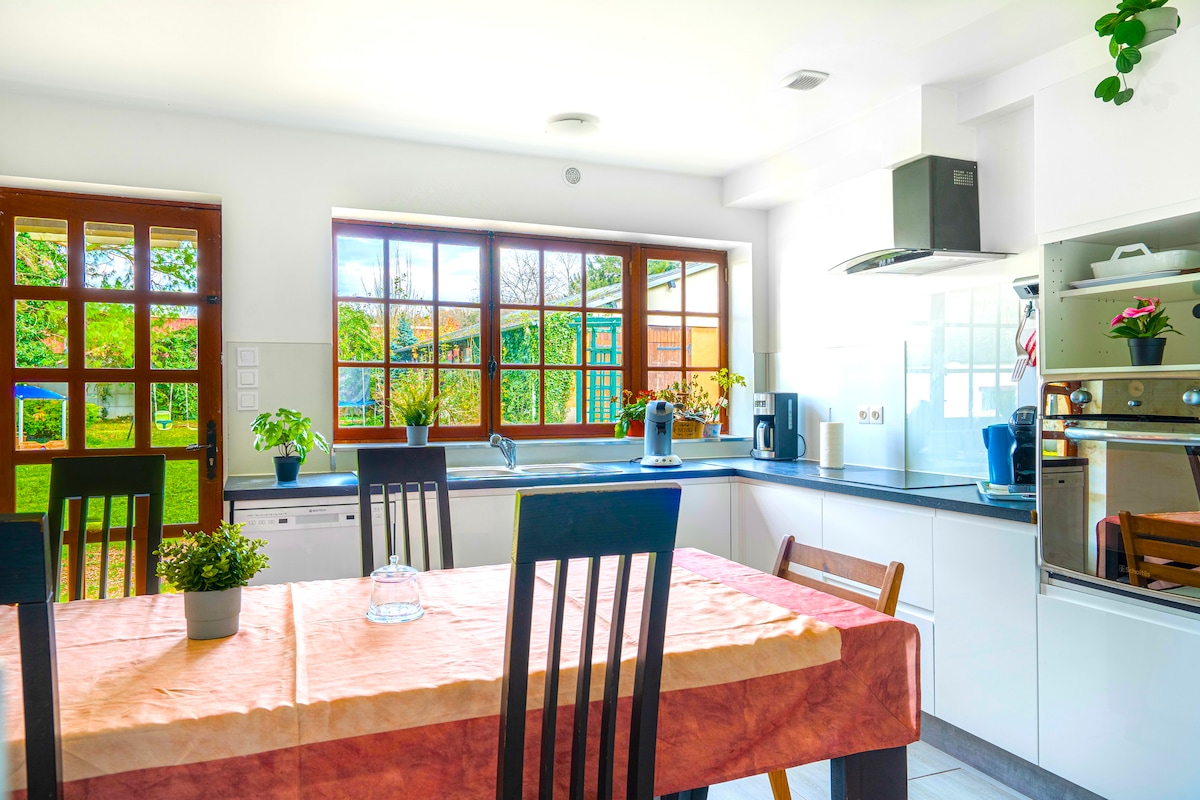 Pristen čar – Popolna sprostitev – Neokrnjena narava. Normandijska hiša na vrtu s površino 6.000 m². Gostje lahko uporabljajo celoten vrt in imajo neposreden dostop do Sene. Vrtno pohištvo in žar vam bosta omogočila, da boste uživali na prostem. Odličen kraj za polnjenje baterij na čudovitem podeželju. Pridite teči, kolesariti ali pa se sprehoditi ob Seni v osrčju regionalnega parka Boucles de la Seine. Okusno urejeno, veselo. Kakovostna posteljnina in oprema.