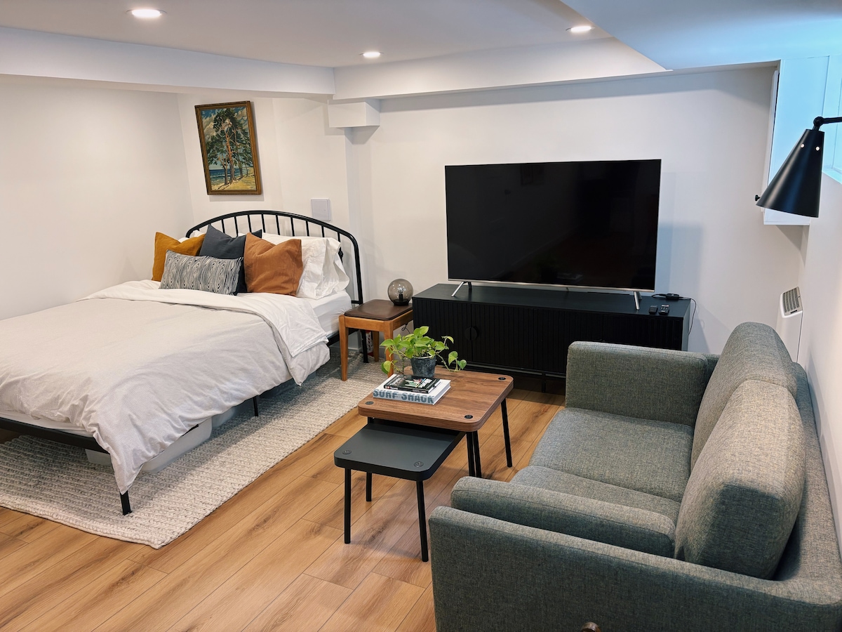 Iz te domače baze, ki se nahaja v središču mesta, lahko preprosto dostopate do vsega za 2 odrasla in 1 otroka. Ta spodnja enota se ponaša z vsem, kar potrebujete za bivanje v mestu. Tik za vogalom podzemne postaje Chester TTC in cvetočega srca Danfortha ima ta drugi dom vse, kar potrebujete za počitek med bivanjem. Samostojni vstop pri našem stranskem vhodu vas popelje navzdol po 6 stopnicah do vašega vhoda v popolnoma opremljeno kuhinjo, pralni/sušilni stroj, kopalnico, zakonsko posteljo (Queen), kavč, TV, Wi-Fi in majhno ločeno pisarno.