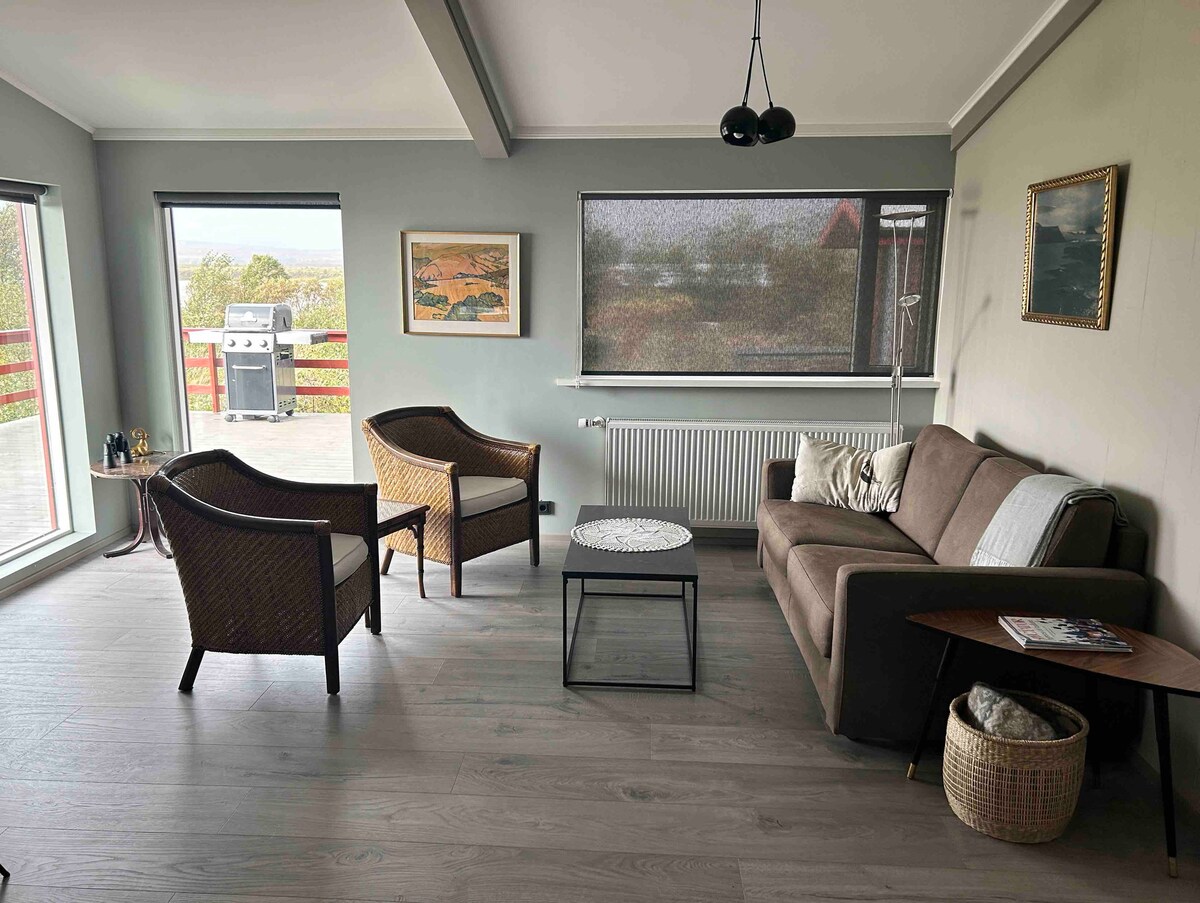 Ta oddih je zelo edinstven in odmaknjen. Ima spektakularen panoramski pogled na gore na dva najbolj znana vulkana Islandije in fantastična opazovanja severnih luči. Hiša je udobna z veliko okni za uživanje v razgledu. Spalni prostor za 4 osebe, udobna postelja v polni velikosti in razkošen raztegljiv kavč. To bivališče ima veliko značaja in islandska umetniška dela na stenah, pa tudi močan Wi-Fi in pametni televizor. Zasebna pralnica s pralnim in sušilnim strojem.