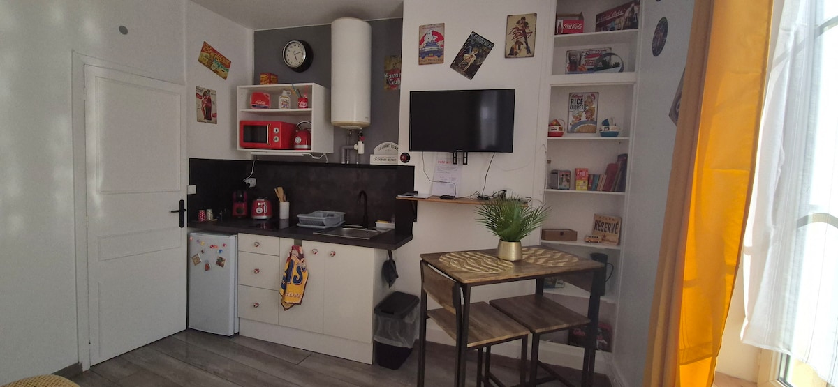 Studio se nahaja v mirni ulici, je popolnoma neodvisen v pritličju in ponuja teraso, ki ni spregledana , središče mesta in grad pa so oddaljeni le nekaj korakov. Parkirišče v bližini (nasproti ali nasproti cerkve). Ima vso opremo, ki vam zagotavlja prijetno bivanje. Posteljnina in brisače so vam na voljo, pa tudi za kosilo (kava, sladkor, čokolada, čaj )in za kuhanje (sol, poper itd.), spali boste v raztegljivem kavču BZ (140/190).