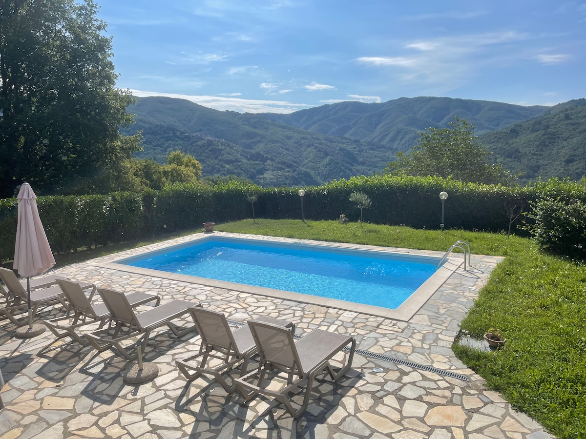 Čudovita hiša s spektakularnim razgledom in neskončnim bazenom. Zelo zasebno, brez drugih gostov ali skupne rabe. To je nekaj drugega. Villa Vetteglia je zgrajena na hribu, razgledi so resnično 360 stopinj. 3 postelja in 3 kopalnica (postelje 7/8 so na udobnem izvleči posteljo v dnevni sobi) Lokacija je zasebna in oddaljena še v bližini Lucca, Pisa in Firence. Bagni di Lucca (za nakupovanje) je 7km. O lokaciji, je na asfaltirani gorski cesti, vendar si oglejte slike, preden opravite rezervacijo :)