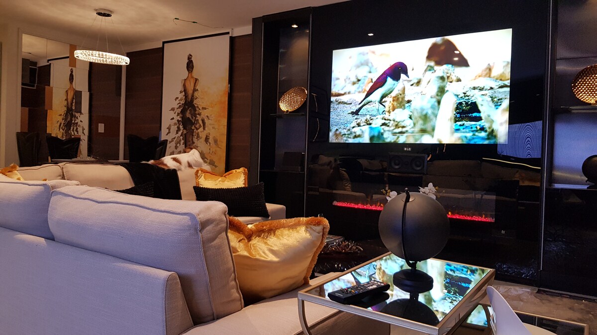 Dobrodošli v tem novem čudovito oblikovanem bivalnem prostoru za goste. Prostor je opremljen s 70-palčnim televizorjem LG 4K HDR v dnevni sobi, ki je združen s popolnoma opremljenim prostorskim sistemom Dolby Digital 5.1, električnim kaminom in hitrim internetom. Vsaka soba ima pametno televizijo 4k. Na voljo je popolnoma opremljena kuhinja, jedilnica, dnevna soba z raztegljivim kavčem, kopalnica in spalnice s zakonskimi posteljami (Queen). Prostor ima zelo lepo sodobno zasnovo. Manj kot miljo stran od nakupovalnih središč, hitre hrane in bolnišnice.