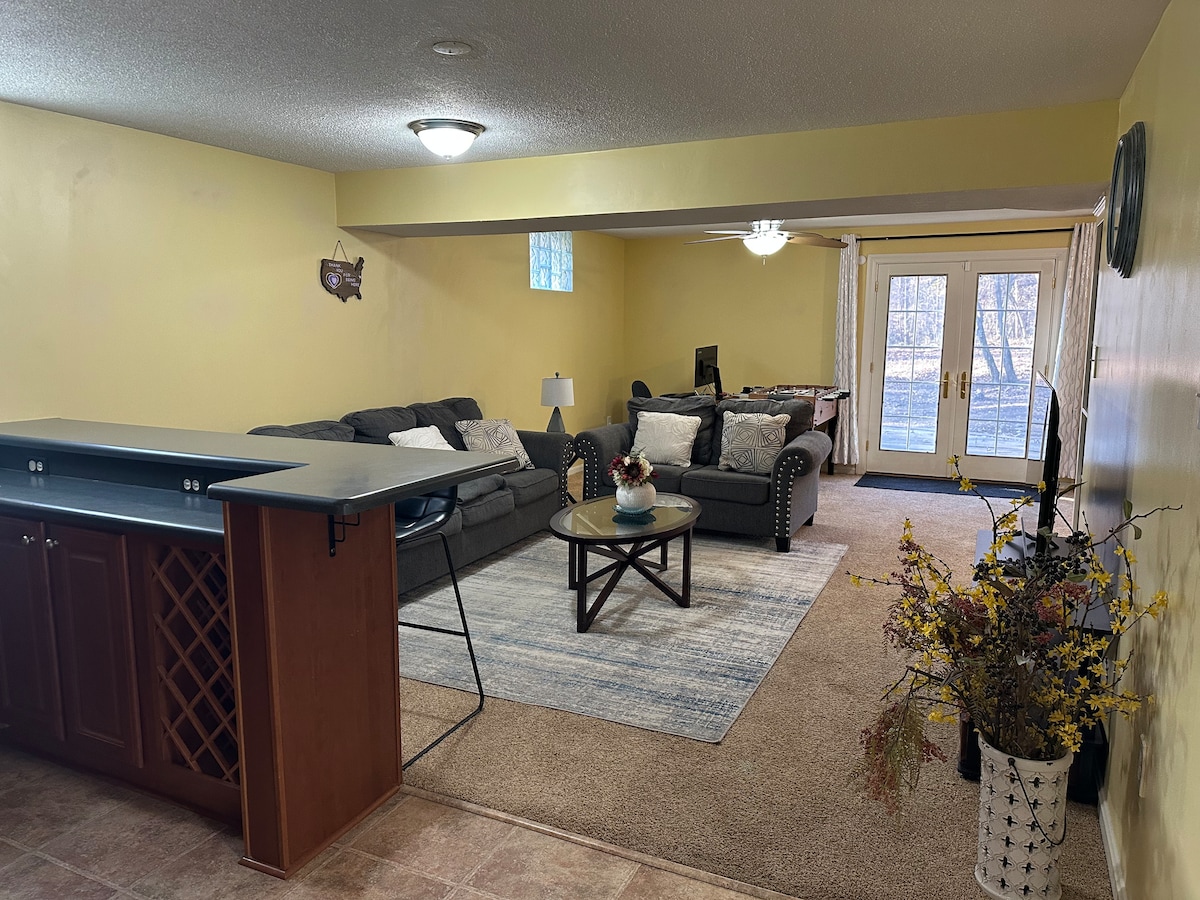 Čisto zasebno stanovanje v kletnih prostorih z zasebno spalnico (zakonska postelja); zložljiva enojna postelja za tretjega gosta, zasebna kopalnica; kuhinja, opremljena s hladilnikom, aparatom za kavo Keurig, kuhalno ploščo, kotlom, mikrovalovno pečico in opekačem; prostorna dnevna soba s kaminom, opremljena s televizorjem (Netflix) in brezplačnim Wi-Fi-jem. Jedilna miza z dvema stoloma. Osnovni kuhinjski pripomočki in jedilni pribor. Delovni prostor: miza, vrtljivi stol. Vhodna pot je nagnjena, zato je lahko otežena za goste z omejeno mobilnostjo.