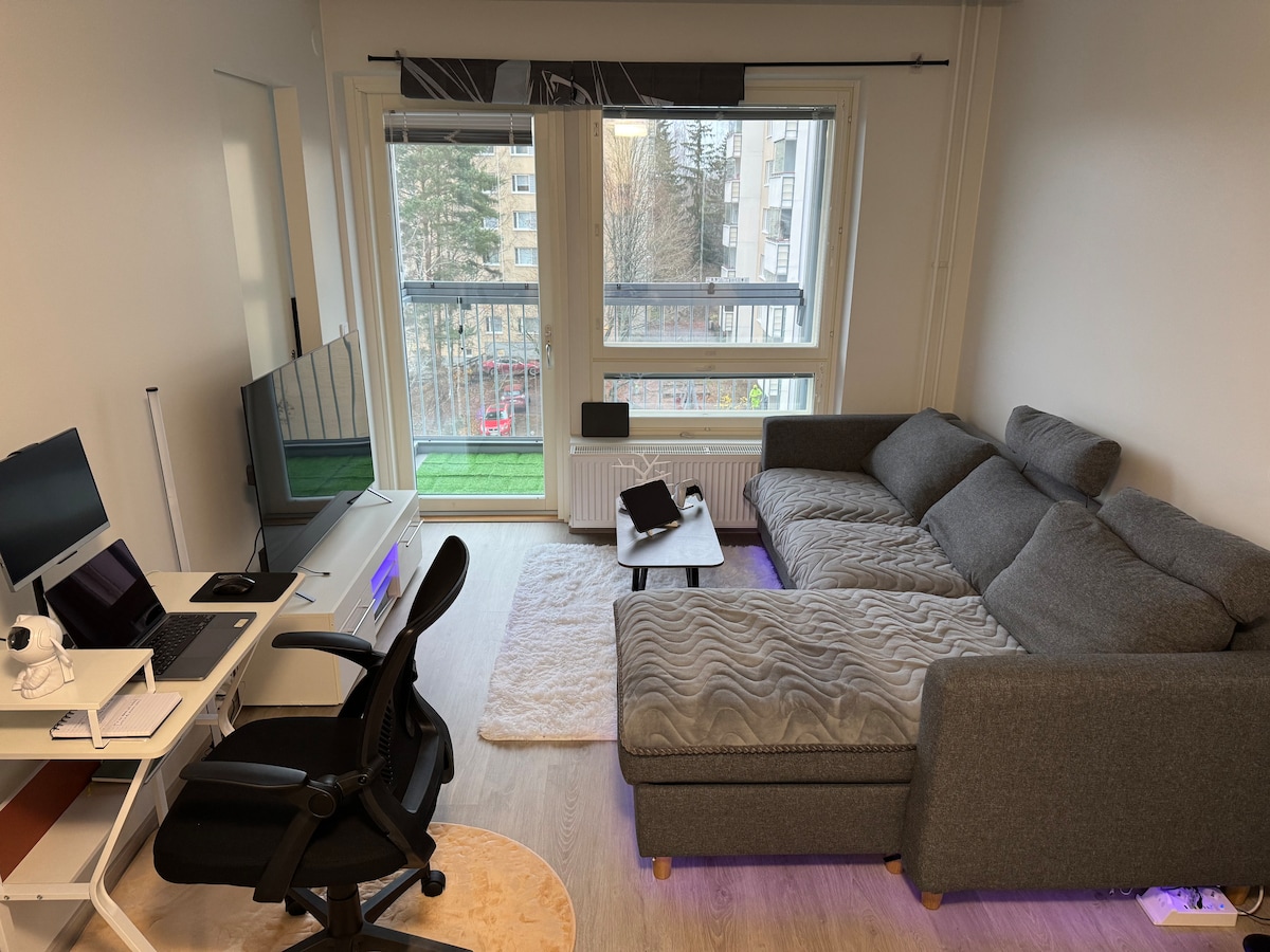 To mirno 2-sobno stanovanje se nahaja v 2. nadstropju mirne, dobro vzdrževane stavbe, zgrajene leta 2016. Ima novo pohištvo, trdo zakonsko posteljo, balkon in kuhinjo, opremljeno z aparati. Na voljo je dobra povezava Wi-Fi in pametna televizija. Do stanovanja se lahko pripeljete z neposrednim avtobusom z letališča ali železniške postaje Tikkurila. Do središča Helsinkov vas loči neposredna vožnja s podzemno železnico. Lokalne znamenitosti vključujejo čudovite gozdove in center za obiskovalce Fazer, ki ponuja odličen brunch.