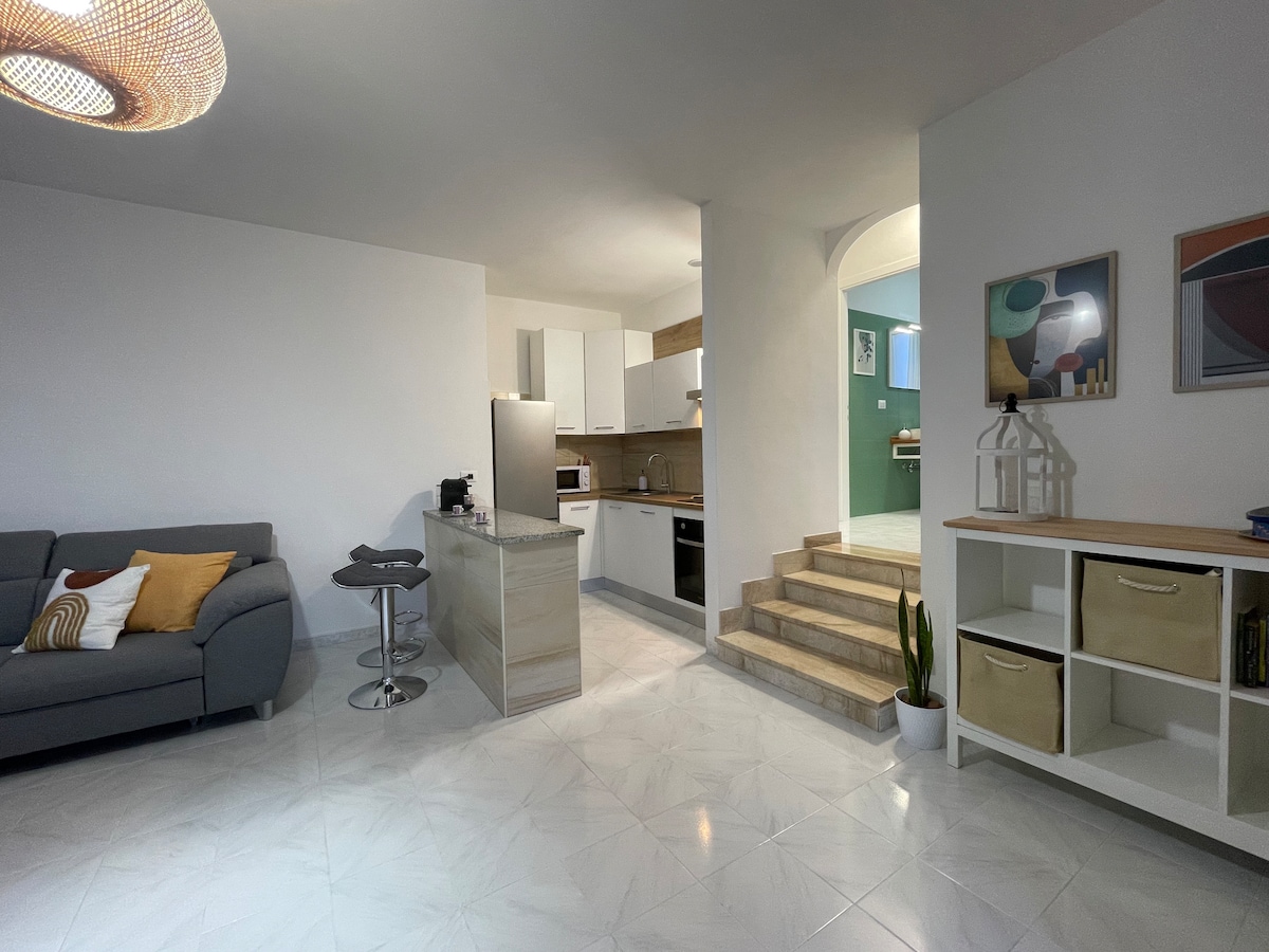 Čudovito fino opremljeno stanovanje, kratek sprehod do vaške plaže. Nahaja se v drugem nadstropju in je ločena z dvema neodvisnima sobama s skupnim hodnikom. Dnevna soba, kuhinja in veranda s pogledom na morje. Če se povzpnete po udobnem spiralnem stopnišču, lahko dostopate do glavne spalnice s kopalnico in velike terase z osupljivim razgledom. Vse sobe so opremljene s klimatsko napravo in Wi-Fi-jem. V neposredni bližini se nahajajo bari, restavracije, slaščičarne, trgovinice in lekarne.