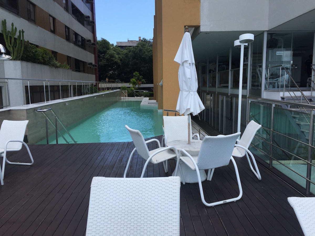 PREDELANO STANOVANJE je v celoti opremljeno s klimatsko napravo, vročo prho, Wi-Fi, pametno televizijo , ventilatorjem, brisačami, posteljnino, pralnim strojem, mikrovalovno pečico, jedilnim priborom, posodo, štedilnikom, hladilnikom parno sobo, bazenom, telovadnico, knjižnico, zen prostorom, garažo, varnostjo, 3 dvigali. Plemenita soseska, vse razpoložljive storitve: lekarne, banke, Walmart, pekarne, trgi, gledališča, v bližini zgodovinskega središča in Bahia de Todos os Santos, 2. največja plovna Bahia na svetu.