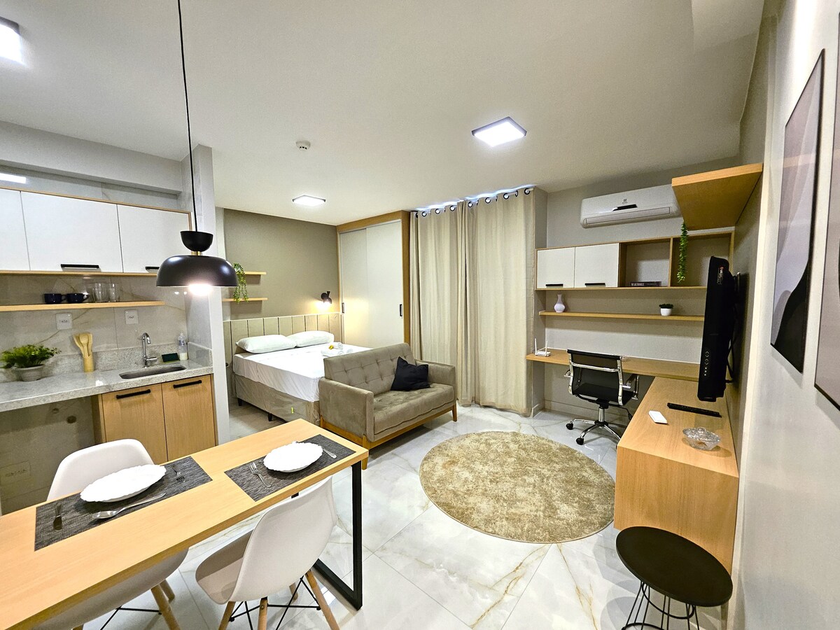 Idealno za tiste, ki iščejo sodobno, udobno in varno okolje. - BALZAM ❄️ - Portaria non stop🚨 - Elektronska ura 📱 – vključeno 1 prosto mesto🚙 (oznaka 15.00 dodatno) - Wi-Fi z veliko hitrostjo 🛜 - Obstaja tržnica (zelo lepo) 🍕 - Enaka razpoložljivost storitve Uber - Udobna postelja 🛏️ - Zakonska postelja (udobna za dve osebi) Posteljnina/kopalni plašč Lepo opremljena kuhinja (cvrtnik, vodni filter, mikrovalovna pečica, lava in suha), pametna televizija v dnevni sobi in spalnici, čudovita kopalnica in čudovit balkon.