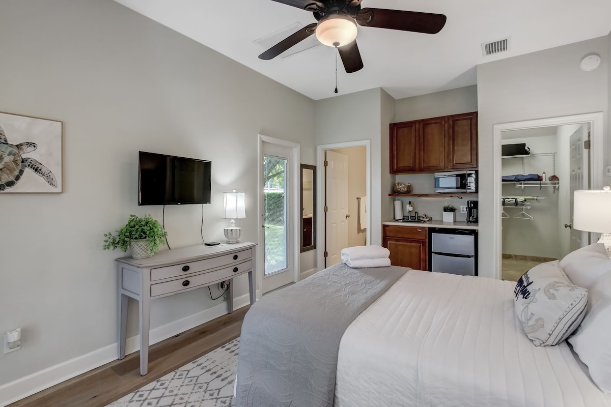 Vaš oddih na otoku vas čaka. Navdušeni boste nad našim veselim draguljem z zasebnim dostopom. Zaradi osrednje lokacije je raziskovanje preprosto. Manj kot 5 minut od zgodovinskih trgovin v središču mesta, restavracij, pohodniških poti, tekaških poti, golfa, jahanja, deskanja in celo padalstva! Uživajte v zakonski postelji, Wi-Fi-ju, televiziji, majhni kuhinji, kotičku za kavo, pralnici z pralnim in sušilnim strojem, (otroška posteljica Pack&Play), posodobljeni kopalnici, pisalni mizi, pokritem parkirišču, terasi in še več! Opomba: Potrebujete le potrjeno osebno izkaznico in nekaj pozitivnih mnenj (na Airbnbju ali podobnih platformah).