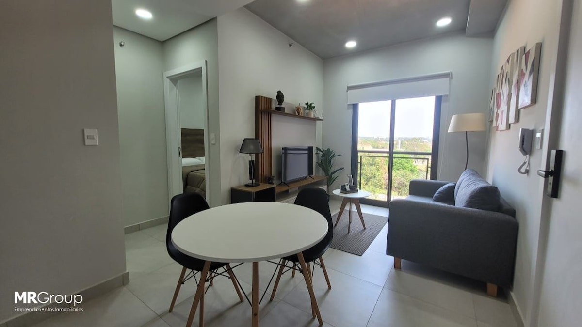 Popolnoma novo stanovanje v razkošni stavbi. Ima svojih 40 m², s pametno televizijo, Wi-Fi-jem, v stavbi pa imate vso opremo: bazen , klimatiziran quincho z žarom, otroško igralnico, opremljeno telovadnico itd. Do najbolj cenjenega poslovnega centra v prestolnici je 5 minut vožnje in 25 minut hoje. Do letališča Silvio Pettirossi je prav tako 11 minut vožnje z avtomobilom Ima zakonsko posteljo in raztegljiv kavč. Skupno lahko spite do 3 osebe.