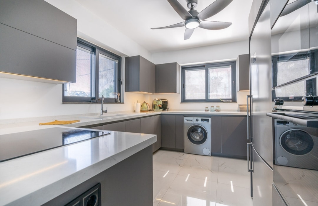 It consists of a total of 4 bedrooms and has accommodation for 8 people. It is quite ideal for large ensembles and large group groups. Everything has been thought of for the customer of our villa, which is furnished in a very stylish and modern way. You can sunbathe on the sun loungers on the pool terrace, eat great meals at the garden table, swing at school and spend pleasant moments.