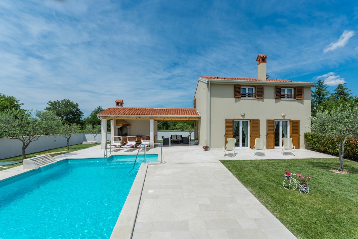 Pristna istrska kamnita hiša zgrajena leta 1922. Hiša je popolnoma obnovljena in opremljena, da vam zagotovi vse, kar potrebujete. Sodobna notranjost, popolnoma opremljena kuhinja, sproščujoča dnevna soba, prostorne spalnice z lastno kopalnico, zunanji jedilni prostor z žarom, zasebni bazen in parkirišče v sklopu namestitve. Vsaka soba je skrbno zasnovana s strani našega oblikovalca. Vse to vam bo omogočilo, da uživate v počitnicah in napolnite baterije.