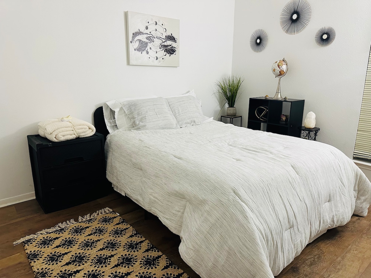 Elegantno in udobno bivališče, v katerem lahko dvignete noge in se sprostite. To je zasebni dupleks in NE DELITE nobene opreme. Delovni prostor, zanesljiv WI-FI, hladilnik, polna kuhinja, pralni in sušilni stroj, ograjeno dvorišče, dnevna soba, ena zakonska postelja in ena zakonska postelja. Ni dostopa do stika in zasebni dovoz z brezplačnim parkiranjem. Pametni televizorji v dnevni sobi in obeh spalnicah. Mirna soseska na osrednji lokaciji, 22 minut do središča Houstona/20 minut do Toyotinega centra, 20 minut do Georgea R Browna