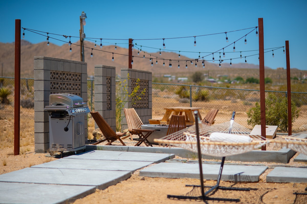 Escape to Black Moon Ranch and discover a haven where tranquility and adventure converge. Whether you seek a romantic getaway, a family retreat, or a solo expedition, Black Moon Ranch is an experience you won't forget. Nestled in the beauty and seclusion of the Mojave Desert, but close to Joshua Tree National Park, Pioneertown, and many more adventures. - Al Fresco Dining Area - Trager + Firepit - Starlink - Covered Patio Areas - Min light pollution - Stargazing - Ping Pong