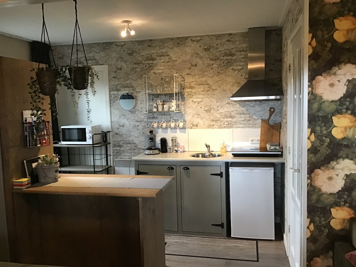 Het huisje ligt in een groene tuin aan de rand van het dorp. De vogels zijn je gezelschap tijdens het verblijf. Geniet van de wind, die je soms hoort ruisen in de bomen. En kijk eens omhoog als je in de tuin zit, naar de toppen van de bomen. Woonkamer 19m2, slaapkamer 16m2. Bed 160x200 cm. Kitchenette met inductiekookplaat en koelkast. Op aanvraag kan self service ontbijt geleverd worden. Er zijn twee fietsen beschikbaar. Station en dorpscentrum: 20 min lopen . Bushalte 6 min lopen.