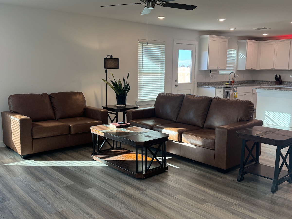 Rustic Ridge combines modern design with black and white accents throughout. The bright living room is bathed in natural light, and the fully equipped kitchen and spa-like bathroom offer ultimate comfort. The bedroom includes a queen-size bed with ample storage, while the loft upstairs features another queen bed and breathtaking views of Palo Duro Canyon. Outside, enjoy a private patio with a bistro table and grill. Located just minutes from the park entrance, it’s the perfect canyon getaway.