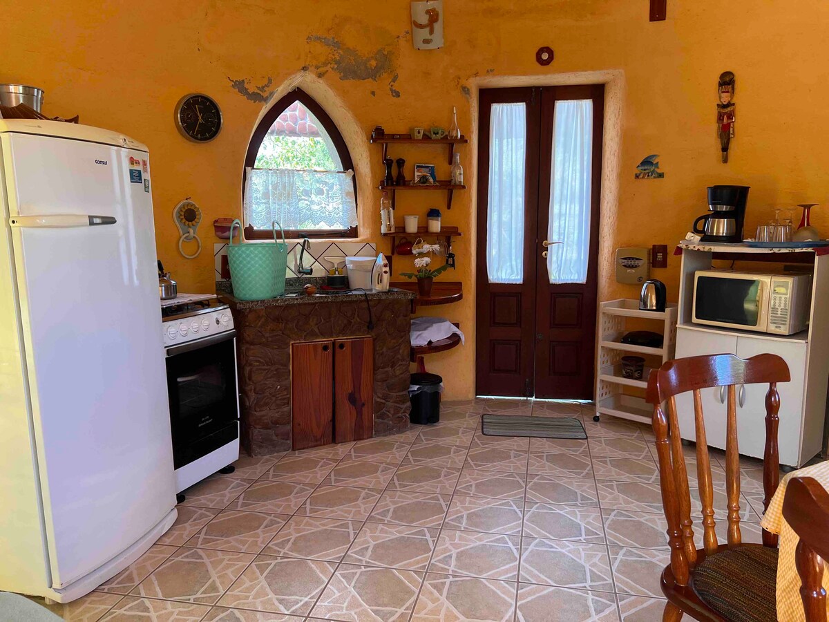 A casa fica no andar térreo e foi construída sob as rochas do terreno. O espaço possui 2 quartos (sem portas, apenas com uma parede divisória), sala, cozinha e banheiro privativos. A pousada possui 4 acomodações no total. Fica no alto do morro com linda vista mar. Os hóspedes tem acesso ainda ao prédio principal com espaço de convivência, cozinha compartilhada e varanda com mesas e cadeiras para relaxar. Localização (Praia do Siriú) - 1km do mar da Praia do Siriú - 7km do centro de Garopaba