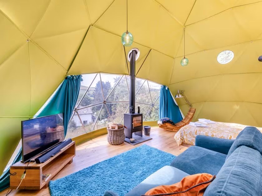 Edinstvena panoramska kupola, ki spi 2 odrasla. Dvojna postelja, gorilnik za hlode in čudovit razgled. Ko vstopite v svojo nenavadno kupolo, vas bo zamikalo, da bi se potopili v zakonsko posteljo in pojedli te razglede. Našli boste tudi udobne sedeže – idealno mesto za skodelico čaja. Preprosto, a učinkovito opremljen prostor krepi občutek, da je to zatočišče. Njegova oddaljena lokacija pomeni, da je kupola izklopljena. Člani kluba Greener Camping Club si oglejte druge podrobnosti spodaj.
