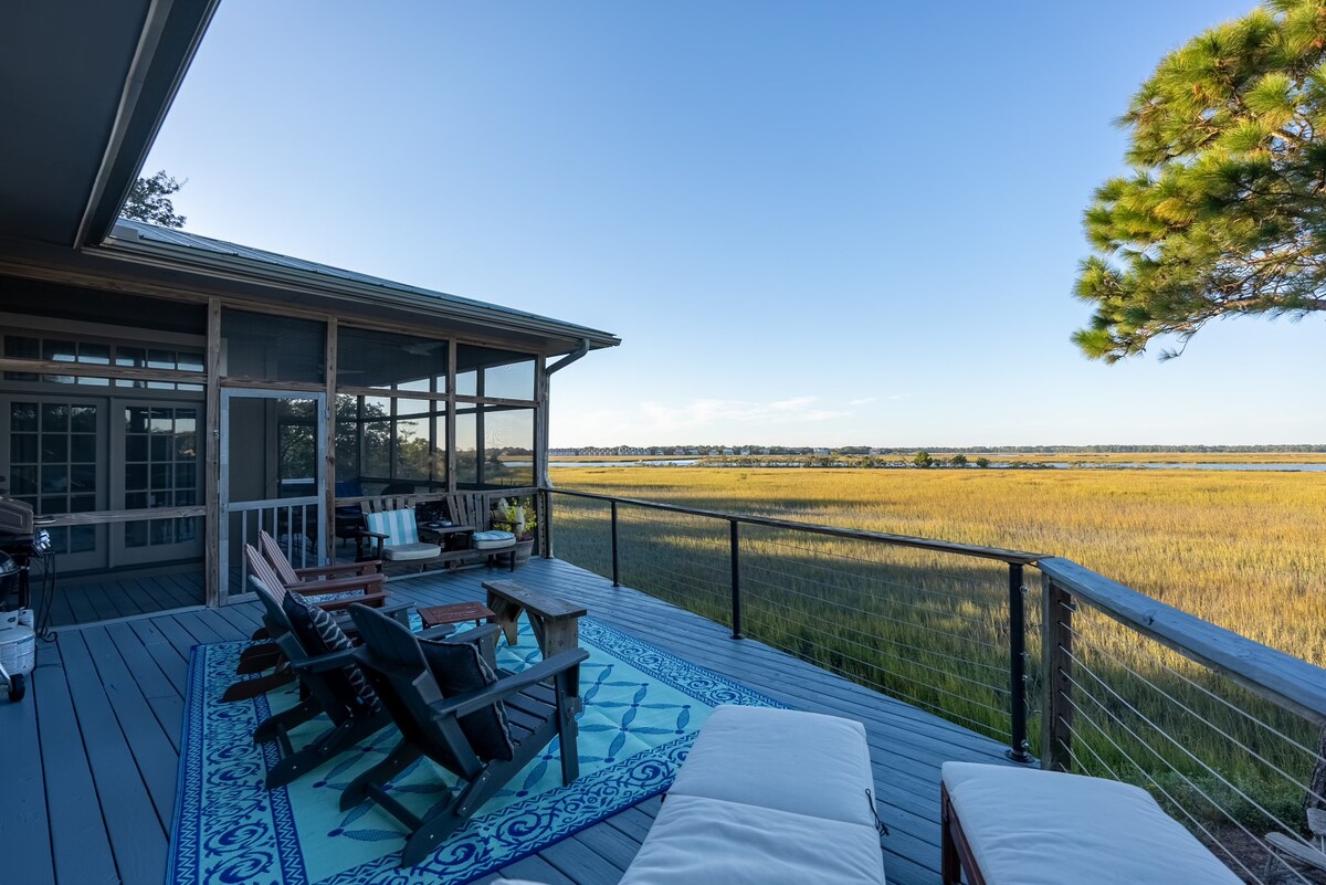 Our home offers some of the most stunning views on Folly! With four private patios, you are able to see amazing wildlife in the marsh, the Intracoastal Waterway, and the Morris Lighthouse. With two king beds, two queen beds, a bunkbed and 3 full bathrooms - there is a plenty of rm Enjoy the hot tub overlooking the marsh, a secluded rooftop room with deck with amazing view; plus Golf hitting bay, darts, ping pong STR23-0364799CF LIC00726