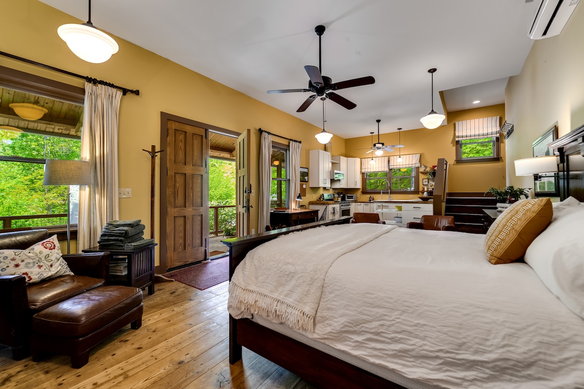 Doživite rustikalno eleganco v hlevu Huffman Creek Retreat, očarljivi koči, obdani z veličastnimi Smoky Mountains. Ta idiličen oddih vključuje 2 udobni spalnici v predelanem stanovanju, popolnoma opremljeno kuhinjo in prostoren dnevni prostor, okrašen z rustikalnim dekorjem. Sprostite se ob peči na drva ali pa se sprostite na zasebni terasi, kjer pomirjujoči zvoki potoka ustvarjajo mirno vzdušje. Ta umik je idealen za samostojna potovanja, pare in majhne družine. Ponuja popolno mešanico odmaknjenosti in udobja.