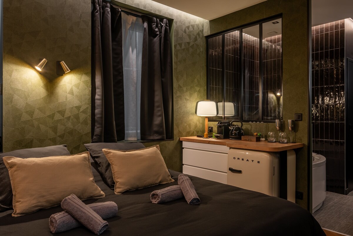Sur les Quais côté Cour (calme). Parfait pour une escapade romantique. • Lit king size 180x200 • Baignoire balnéo • Télévision grand écran • Réfrigérateur • Machine Nespresso, dosettes et thé • Linge de lit et serviettes fournis • Sèche cheveux, savon, gel douche, shampoing • Boulangerie proche • à 10 min de la gare à pied, à 5 min de l'hypercentre à pied, accès autoroute immédiat • non fumeur • Ce logement privatif n’est pas équipé d’une cuisine (format chambre d’hôtel)