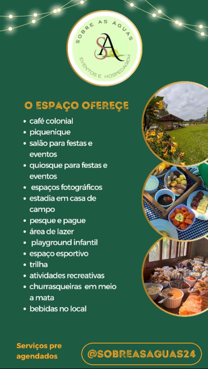 Espaço de lazer em meio a natureza. Café colonial, almoço aos domingos,porções,(conforme agenda) , salão de festas, hospedagem