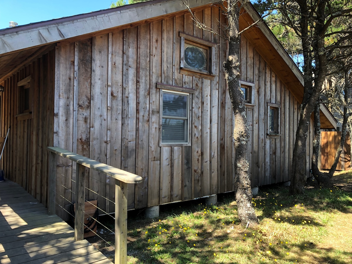 Vabimo vas, da bivate v naši lepo opremljeni hiški, ki se nahaja 3 milje severno od FB-ja, 1/2 milje od oceana na 15 čudovitih hektarjih v sončnem pasu. Sprostite se v mirnih gozdovih sekvoj in uživajte v zasebni terasi s ognjiščem za nočne kresove in vročo kopeljo za razkošje v topli vodi, medtem ko opazujete zvezde na jasnem zraku. Na voljo je popolnoma opremljena kuhinja z vso opremo, zato ostanite tako dolgo, kot želite. Koča ni primerna za otroke, mlajše od desetih let.