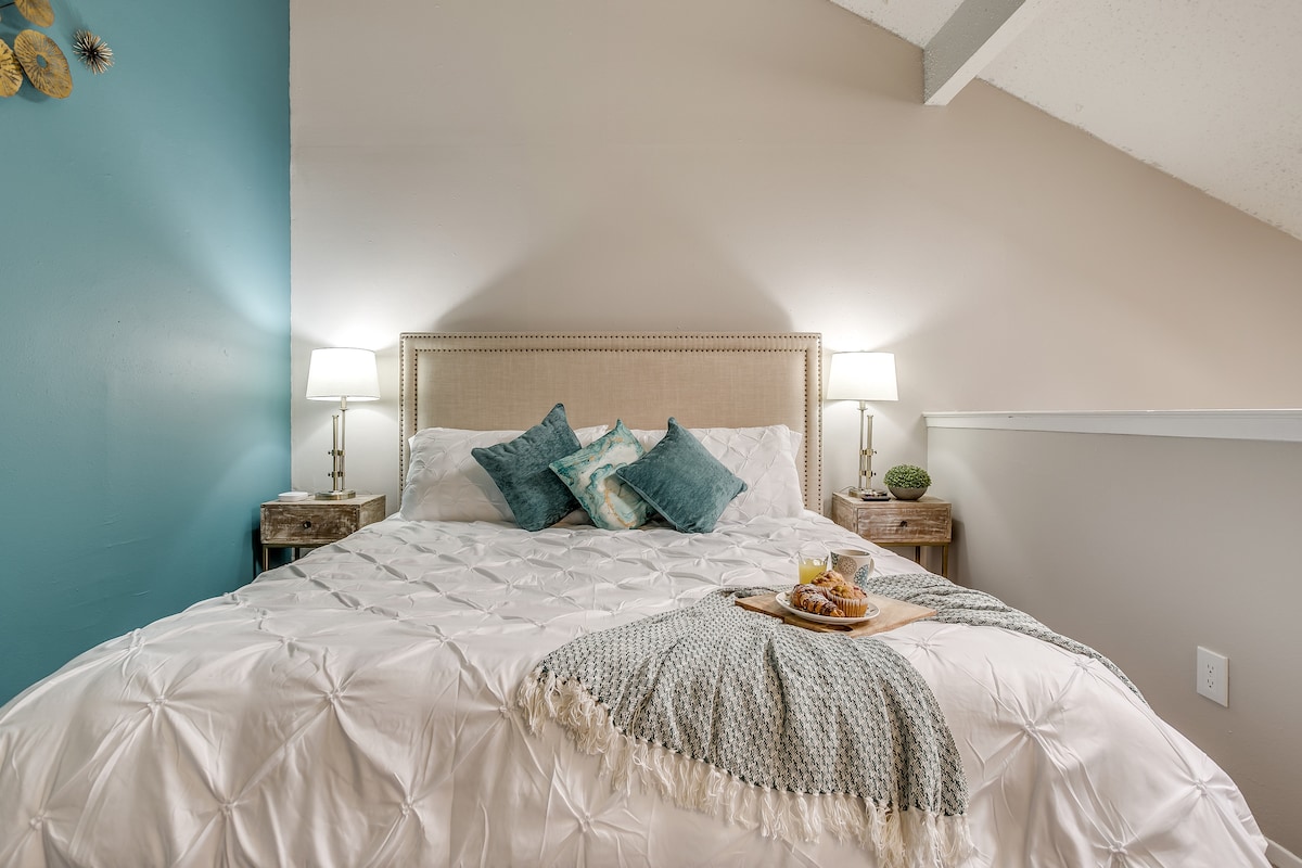 Uživajte v Fort Worthu v slogu s tem elegantnim in funky stanovanjem v soseski Near Southside. Do bolnišnice JPS ter eklektičnih restavracij in trgovin na zgodovinski aveniji Magnolia je stanovanje le 10 minut vožnje do kulturnega okrožja in 5 minut vožnje do središča mesta. Naše prostorno stanovanje ima teraso na strehi, 55-palčno pametno televizijo, razkošno posteljnino, popolnoma opremljeno kuhinjo in pokrito garažo z daljinskim upravljalnikom. Idealno za nočne izlete parov, potujoče strokovnjake in turiste v Cowtownu.