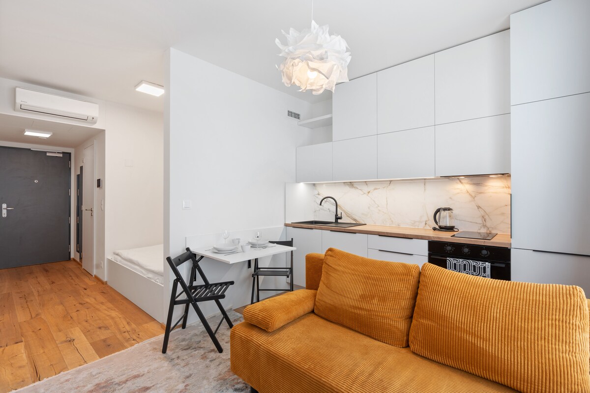 Dobrodošli v našem novem in popolnoma opremljenem stanovanju v osrčju Karlína, v katerega se boste zaljubili na prvi pogled. To elegantno prenočišče ponuja popolno kombinacijo udobja s sodobno dekoracijo in standardi kakovosti. Odprta postavitev nudi udoben dnevni prostor, opremljeno kuhinjo, spalnico in sodobno kopalnico. Studio se nahaja v priljubljenem okrožju Praga 8 - Karlín in je odlično izhodišče za raziskovanje mesta. Rezervirajte zdaj za razkošno bivanje v središču mesta.