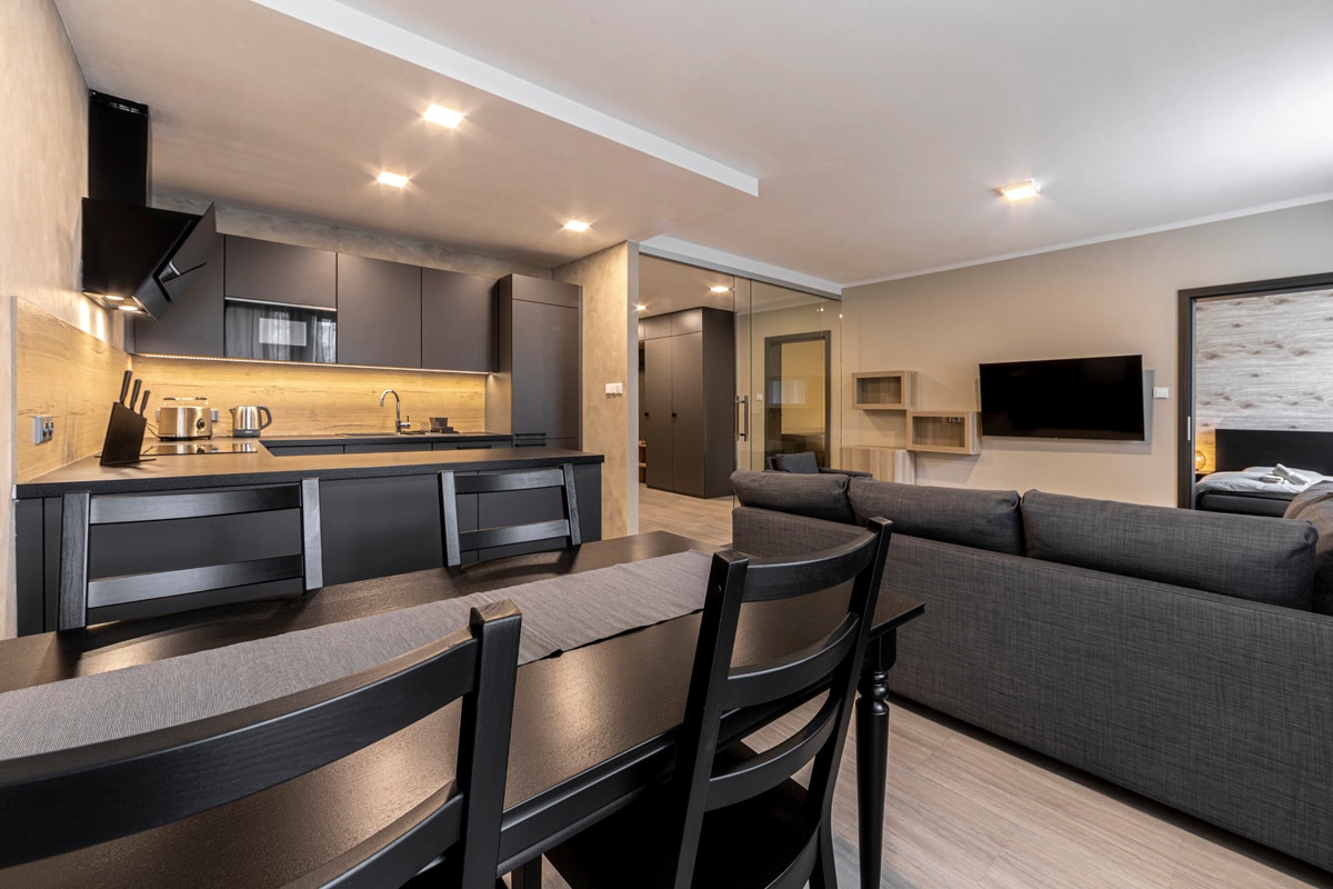 Udobna garsonjera s popolnoma opremljeno kuhinjo, ki vključuje vse potrebne kuhinjske pripomočke za kuhanje. Kuhinja je opremljena z dvema indukcijskima kuhalnicama, mikrovalovno pečico, majhnim hladilnikom, aparatom za kavo in grelnikom vode. V kopalnici sta pralni in sušilnik za lase. Stanovanje je opremljeno tudi z sefom za varnost dokumentov in dragocenosti naših gostov, sušilnikom za perilo, likalnikom, likalnikom in televizijo. Apartma lahko sprejme do 2 gosta (zakonska postelja 160x200).