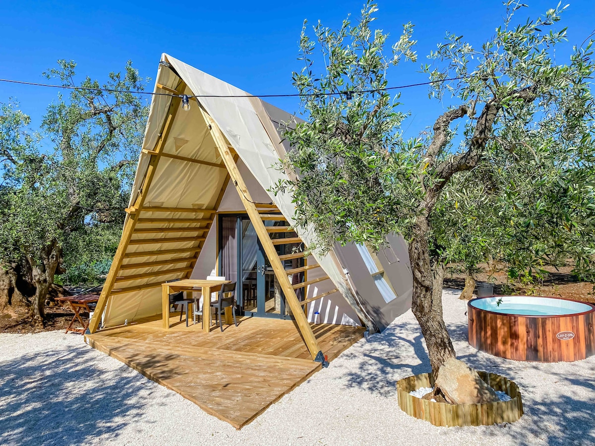 Escape from routine and reconnect with nature in this unique A-frame tent nestled amongst dozens of olive trees in the heart of Puglia. We are the most unique glamping site in Puglia! But what does glamping mean? Glamping is where nature meets luxury, it combines the words camping and glamour. Chic and eco-friendly,our glamping tents guarantee the contact with nature with all the comforts of home: private indoor shower, fully equipped kitchen, air conditioning, Tv and hot tub.