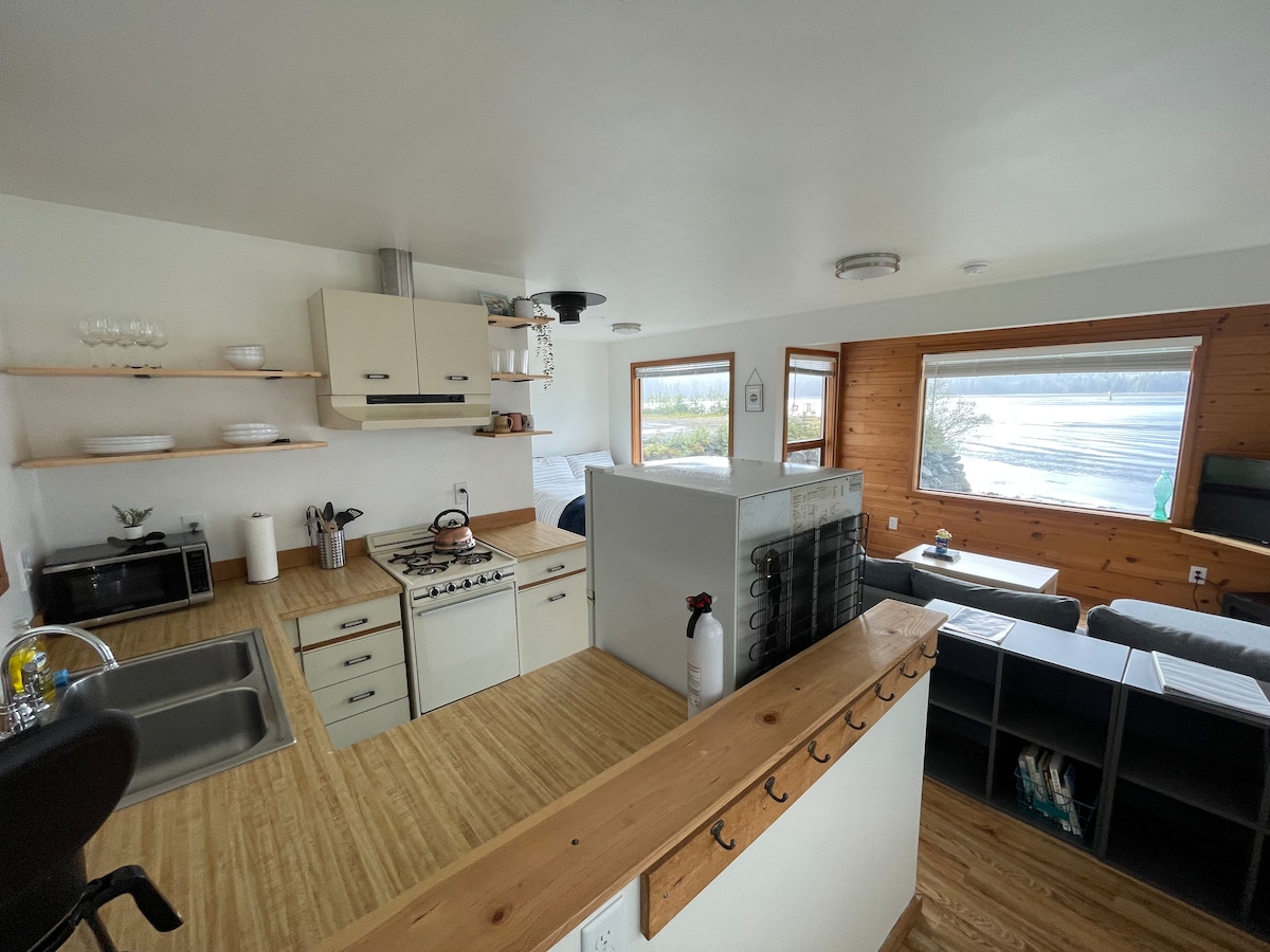 **June 2026 there will be roofwork Monday-Thursday and may be daytime noise / workers present. We have blocked those days but can open if requested.** Driftwood Palace is a recently renovated 1 bedroom / 1 bathroom waterfront guest suite. A short 5 minute drive from downtown Petersburg, but feels a world away with water views from nearly every room. The West-facing covered porch is just feet from the Wrangell Narrows, and is great for watching sunsets, wildlife, and boats.